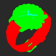この例は、レンダーIDの出力が必要な時計アセットの3つのマスクを示しています。ラバーストラップ用のマスク、時計の金属用のマスクがあり、3番目のマスクは時計の針です。さまざまな領域のマスクを使用すると、ルックデベロップメントアーティストはオブジェクトのさまざまな部分を調整したりレンダリングしたりできます。