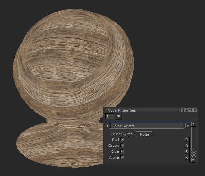 のColor Switchノードを使用すると、チャネルをオン/オフに切り替えて、出力からチャネルを削除できます。これは、単一チャネルで表示したい画像がある場合に便利です。たとえば、マスクを赤、緑、青だけにすると、複数のチャネルを1つのテクスチャに組み合わせることができます。