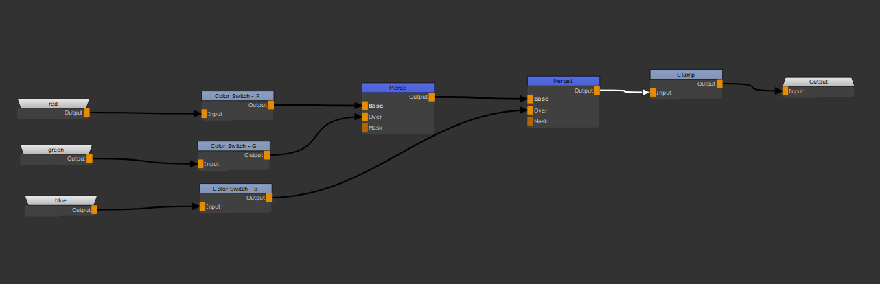 を使用してColor Switchノードでは、各マスクを純粋な赤、緑、青に変えることができます。次に、それらをマージする必要があります。