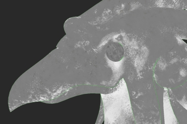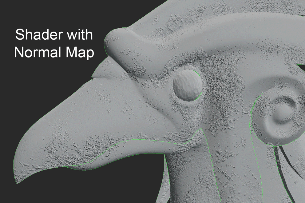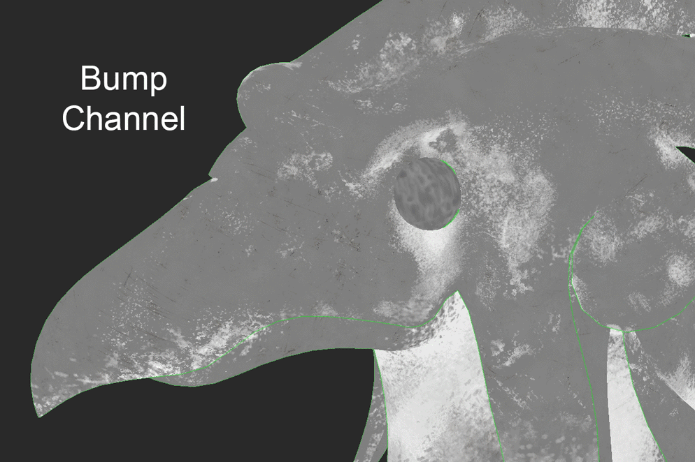 例では、設定されたバンプチャネルは、くちばしと目の周りの領域を上げるべき場所をメッシュに通知します。バンプマップを通常のデータに変換すると、高さに加えて「面」が作成され、ライトがジオメトリに当たったときに、より現実的な鏡面反射の分割が生成されます。
