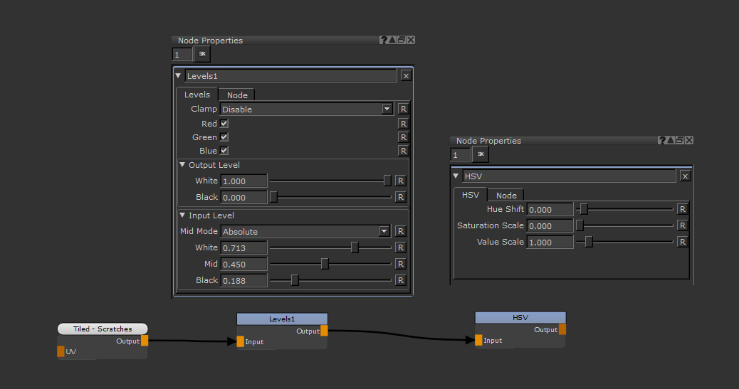 この画像を画像マネージャからメッシュに追加して、 Tiledノード。次に、 Levelsノードを使用して画像のコントラストをさらに強調し、HSVノードを使用して画像の不要な彩度を削除します。