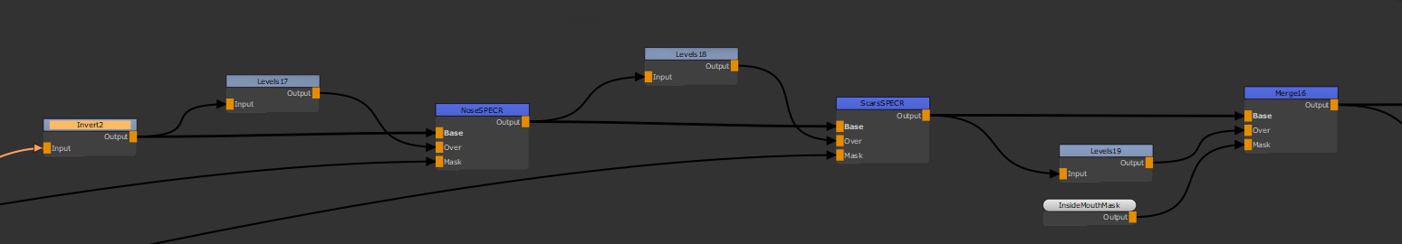 そこから使用できますLevelsノードを使用して、メッシュの異なる部分に異なるグレードを適用します。口の中なので、鼻と目の周りはより湿っているように見え、マスクを作成し、 Levelsノードは、それらをより暗くすることができ、スペックをよりタイトにできることを意味します。