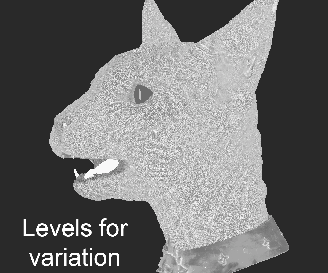 持っている資産ColorそしてBumpチャネルはすでにテクスチャリングされています。ここで使用していますLevelsメッシュの異なる部分の値を微調整するために、異なるマスクを持つノード。