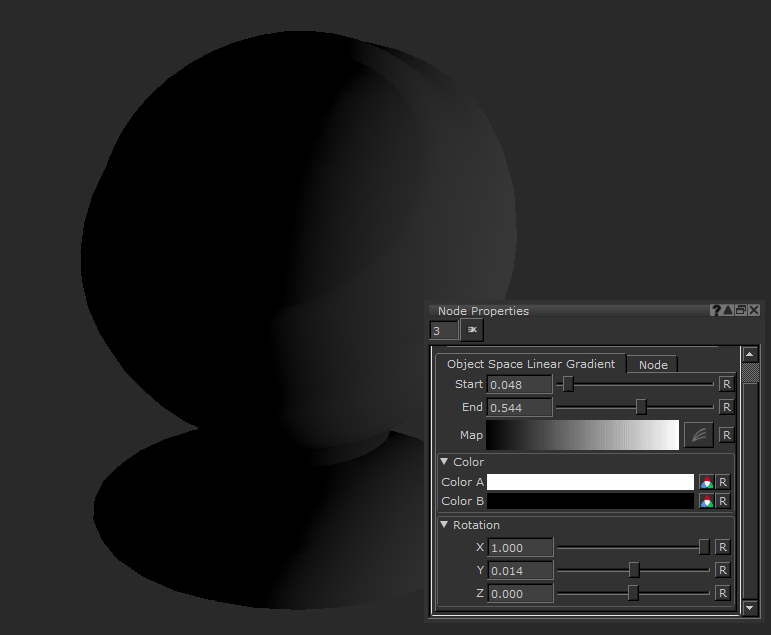 ドロップダウンすることによってObject Space Linear Gradientノードマスクの作成を開始できます。最初に取得することですRotation正しい。Y軸であるジオメトリの高さに沿って配置したいので、 X 0である必要があり、 Y -1である必要があります。次に、開始スライダーと終了スライダーを使用して、締め具合を変更できます。