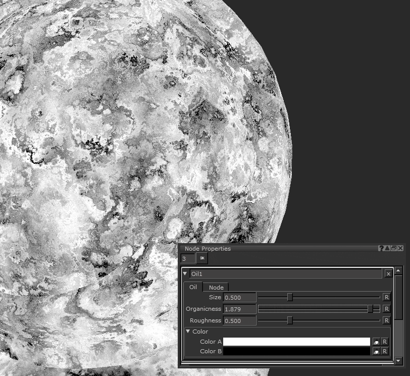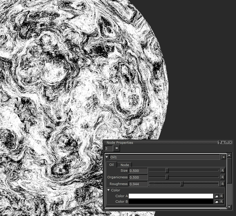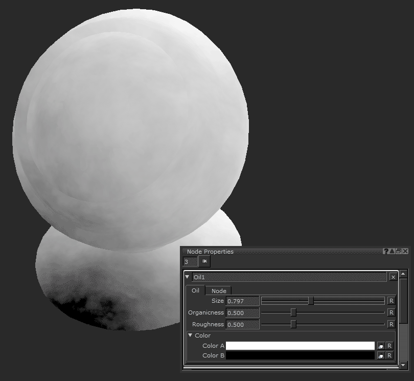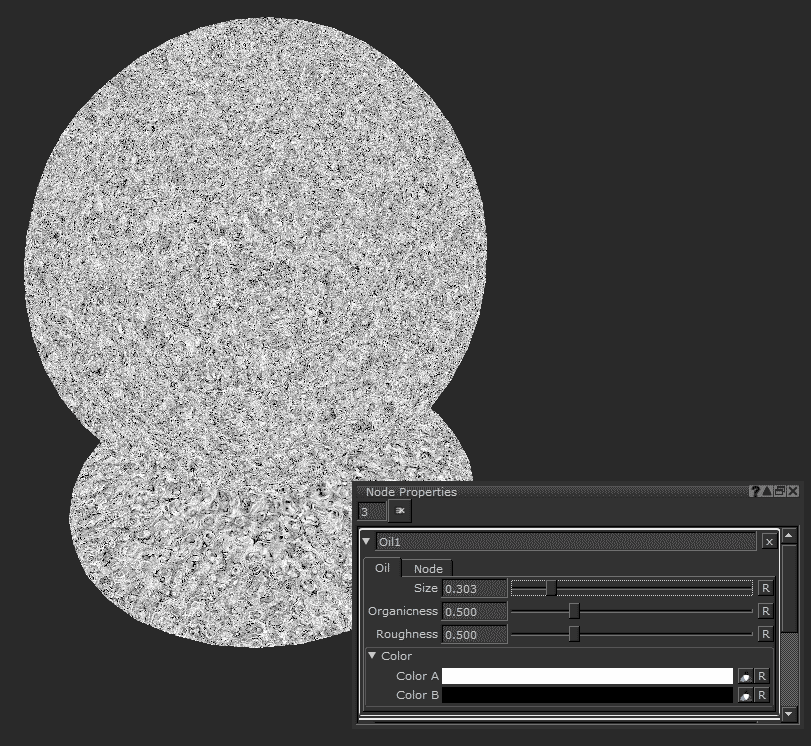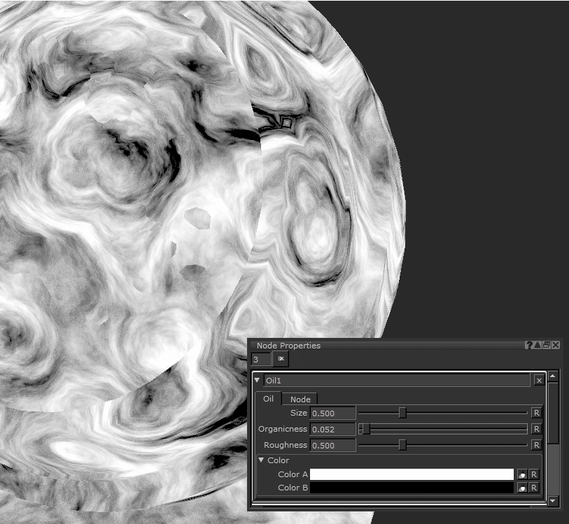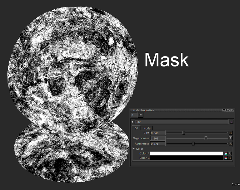 のOilノードは、滑らかなスタイルのパターンを作成する手続き型ノイズノードです。入力を変更することで、さまざまな結果を生成できます。その結果を使用して、内部にある一連の手続き型テクスチャを作成できます。 Mari。これはマスキングに最適ですが、コケ、石、土など、他の手順ではマッチングほどうまくいかない、より有機的なスタイルのテクスチャをエミュレートします。