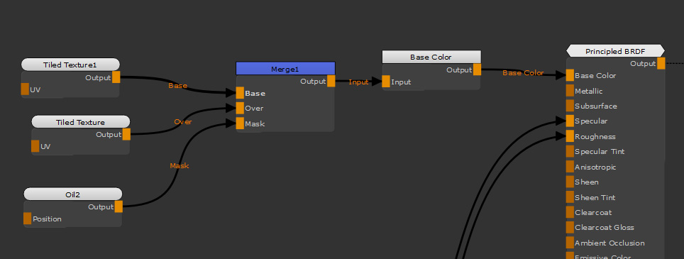 の変更Colorノードのプロパティ、またはノードを既存の画像と投影とマージして、分散と分割を生成できます。また、特定の場所にのみオイルエフェクトを適用して、さらに分散させるマスクを作成することもできます。