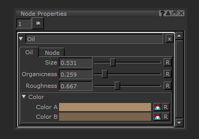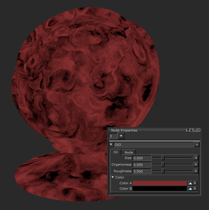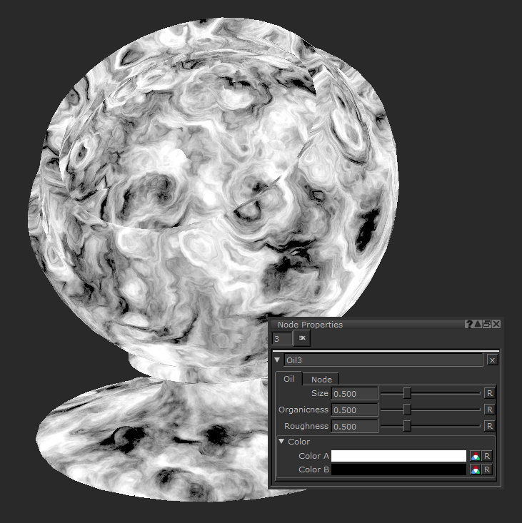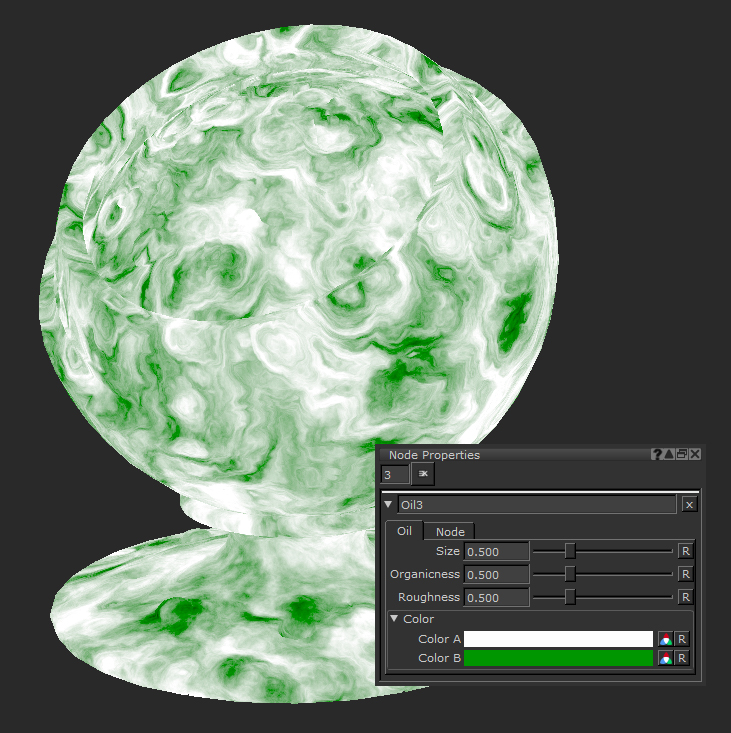 の有機的な外観Oilノイズノードは、他の手続き型ノードで簡単に実現できるものではない場合が多く、3つのスライダーのみでさまざまな結果を得ることができます。