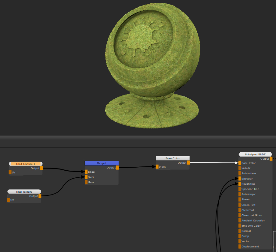 ここには2つありますTiledテクスチャ、ダート、グラス、一緒にマージされ、 Base ColorこれのPrincipled BRDFシェーダー。