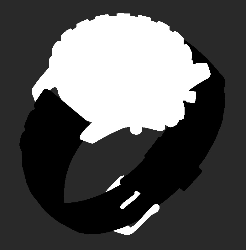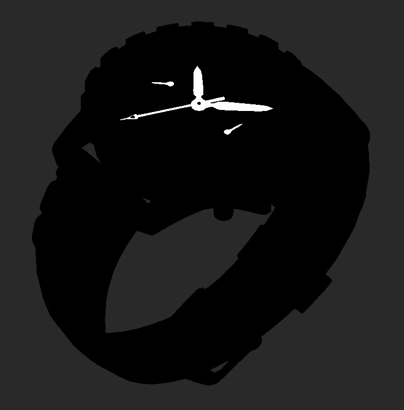 この時計のアセットには3つのマスクがあり、1つは革ストラップ用、もう1つはすべての金属用、3つ目は時計の針用です。彼らはにインポートされていますPaintノードですが、個別に使用できるように、それらを白黒のマスクに分割する必要がありますMari。
