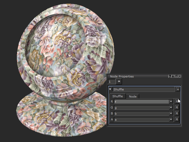 R、G、Bを同じ出力に設定すると、そのチャネルのグレースケール出力が得られます。これは、チャネルパックされた画像が個々のマスクを取得するのに特に役立ちます。 デフォルトではShuffleノードは各チャネルをそれ自体として出力し、変化はありません。 |