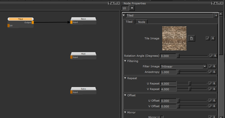 のTiledノードを使用すると、 Image Mangerで定義した回数だけ繰り返して、UV全体にタイルを張ります。 Node Properties。これは、マスクの設定、手続き型テクスチャリングノードツリーの作成、余分な詳細を含む単純なテクスチャの分解など、さまざまなタスクに使用できます。
