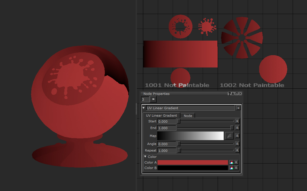 のUV Linear Gradientノードは、オブジェクト全体にグラデーションカラーを適用する優れた方法です。このノードには、結果を変更するための多くのオプションがあり、オブジェクトのUVのレイアウト方法に基づいてクイックマスクを作成するのに非常に便利なノードです。プロパティを編集することで、より緩いまたはよりタイトなグラデーションを作成でき、提供されているランプオプションを使用して、出力に忠実度のレベルを追加できます。