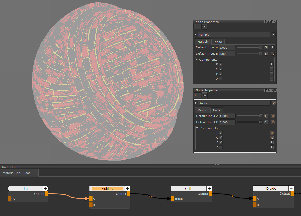 注意:  Ceilノードは、 ノードですが、入力値を切り上げるため、結果の色は浮き上がって表示されます。