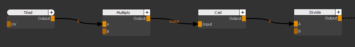 Ceilノードを使用して、テクスチャカラー入力から単純なポスタリゼーション効果を作成できます。ポスタリゼーション効果のレベル数を定義するには、 MultiplyそしてDivideノード、次のように、 MultiplyそしてDivideB入力は、ポスタリゼーション効果で必要なレベルの数です。