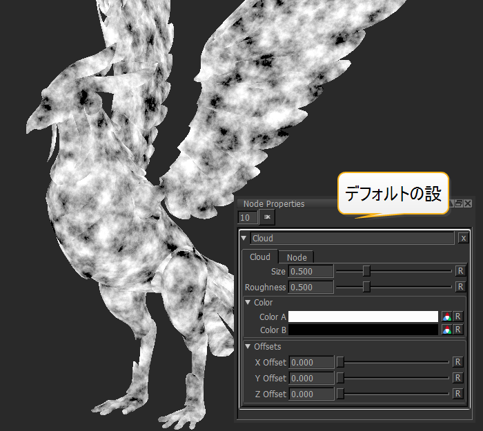 のCloudノードは、雲のようなテクスチャをシミュレートするランダムパターンを生成するノイズノードの一種です。通常、2つのノード間のブレンドの量を制御するマスクとして使用されます。