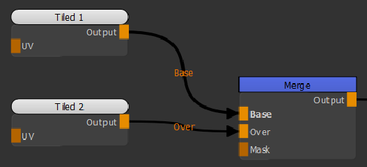 | 1. | 2つを接続TiledへのノードMergeノード。 のTiled 1ノードはに接続されていますBase入力とTiled 2ノードはに接続されていますOverの入力Mergeノード。 |