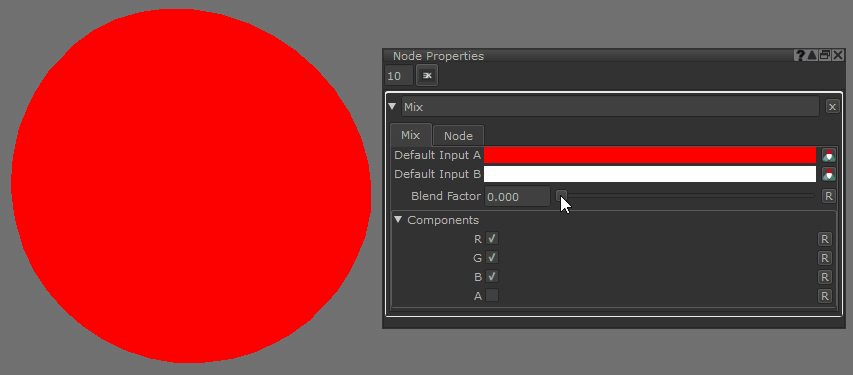 のMixノードは、入力ブレンド値に基づいて2つのカラー入力間を線形補間します。もしBlend Factor 0、色Aが出力されます。もしBlend Factor 1、カラーBが出力されます。あBlend Factor 0と1の間の値は、 AそしてB。
