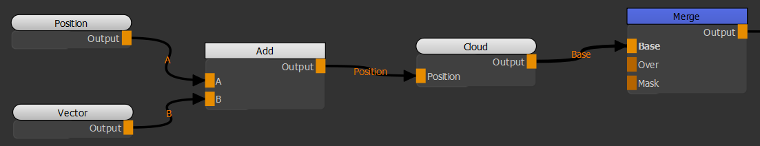 | 2. | を作成するAddノードに接続し、 Positionの入力Cloudノード。を作成するPositionノードとVectorノードに接続し、それぞれにAそしてBの入力Addノード。 |