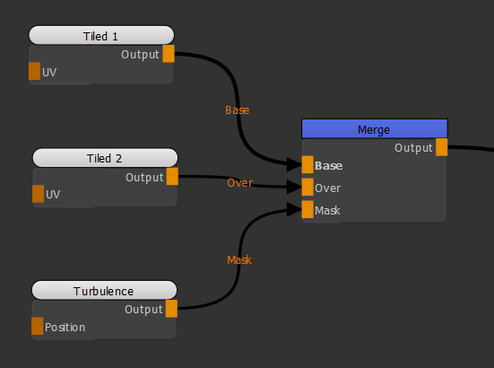 この例では、 Turbulence 2つの異なるテクスチャの上にあるマスクとしてのノード(Tiled 1そしてTiled 2)素敵なブレンドされたテクスチャを取得します。