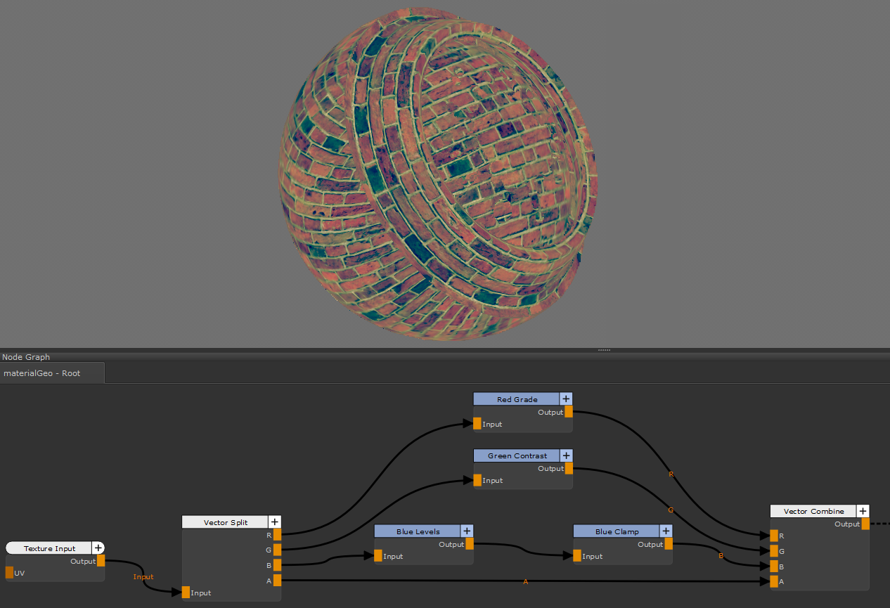 この使用Vector SplitそしてVector Combineノードは、ビデオゲームのテクスチャを操作するときに特に役立ちます。これらのテクスチャは、多くの場合、次のような複数のチャネルを意味するようにパックされています