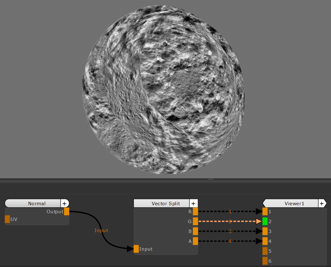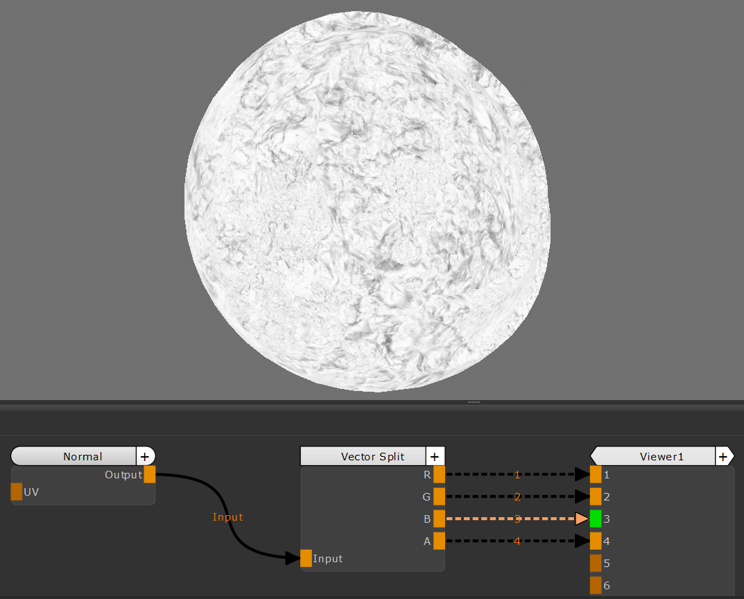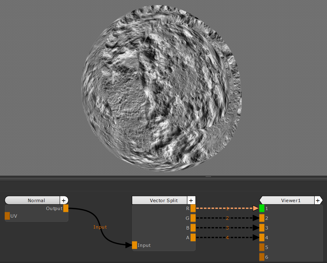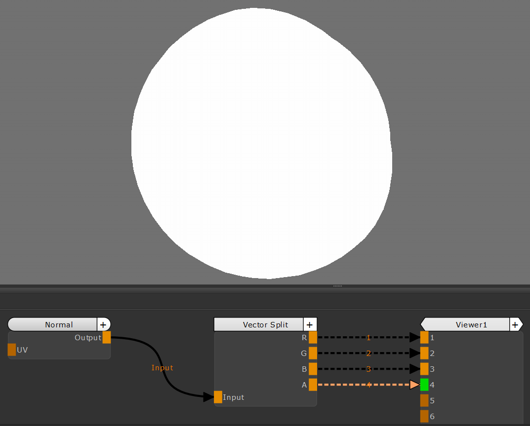 のVector Splitノードは、ベクトルを個別のコンポーネント(R、G、B、A)に分割します。このノードは、特定の色をベクトルから分離して個別に調整したり、画像やマップから完全に抽出したりする場合に役立ちます。