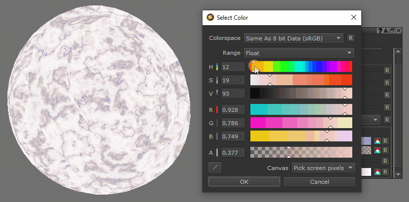 Mariでは、単一のOCIOカラー選択カラースペースを使用して、保存されたすべてのカラーとカラー選択ツールのカラースペースを定義します。これにより、選択した色を管理するときに、「見たとおりの結果が得られる」ワークフローが実現します。