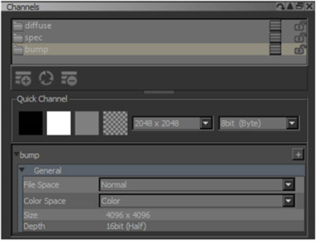 注意: 指定した名前のチャネルをすでに作成していて、同じ名前で新しいチャネルを作成しようとした場合は、 Mari名前を増分して、元のチャネルと新しいチャネルを区別します。たとえば、「diffuse」チャネルがすでにあり、「diffuse」という名前の別のチャネルを作成した場合、 Mari自動的に「diffuse1」という名前が付けられます。