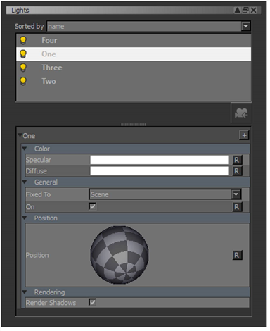 | 2. | 個別の照明方向を設定するには、完全照明モードになっていることを確認してください。まだ表示されていない場合は、 LightsクリックしてパレットView > Palettes > Lights: |
