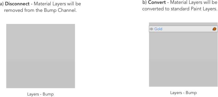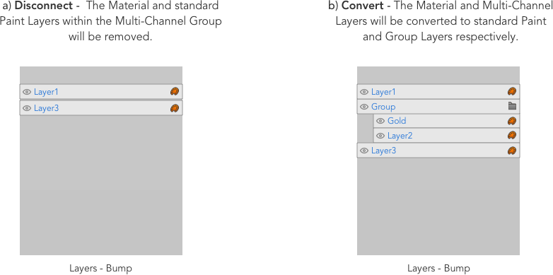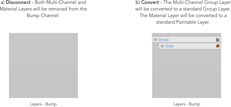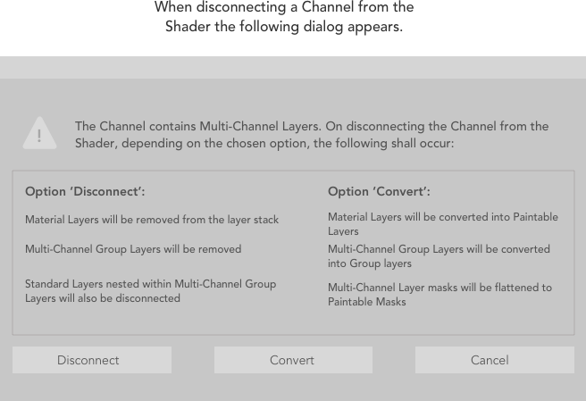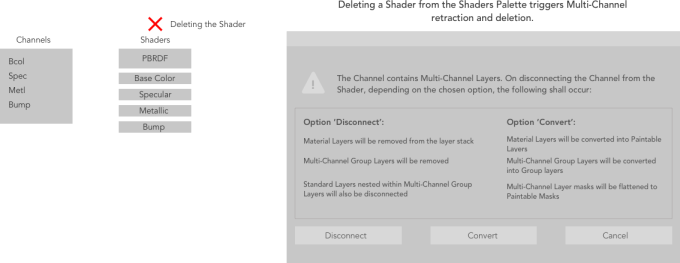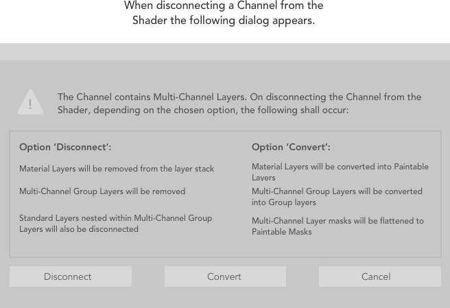 ダウンストリームシェーダーからチャンネルを切断すると、ダイアログで選択したオプションに応じて、マルチチャンネルレイヤーを切断するか、標準レイヤーに変換するか、削除する必要があります。