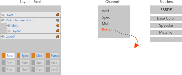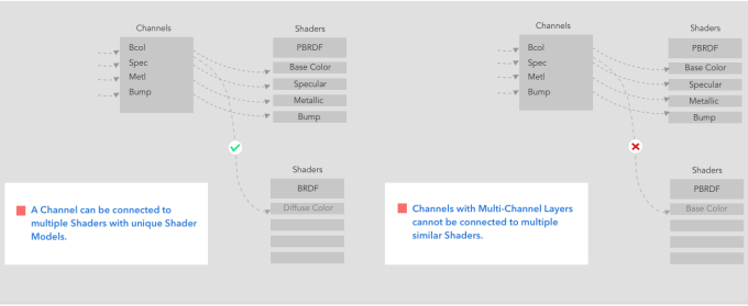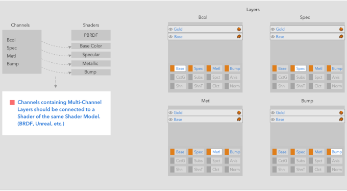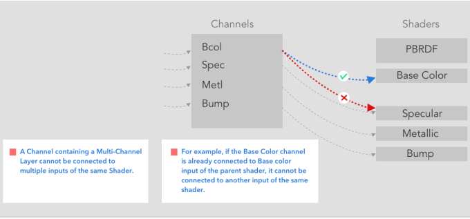 マルチチャンネルレイヤーを含むチャンネルは、固有のシェーダーモデルを使用して複数のシェーダーに接続できますが、類似の複数のシェーダーには接続できません。