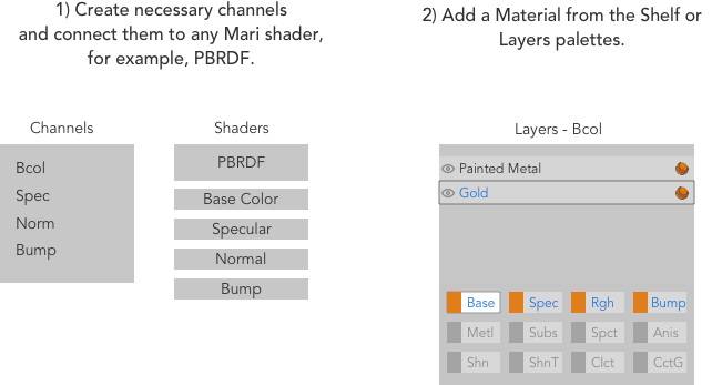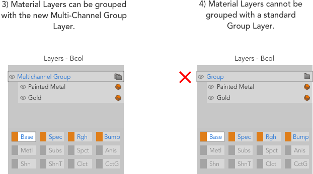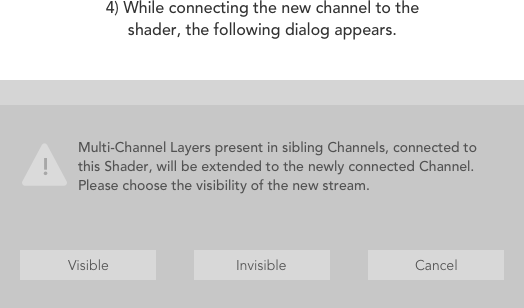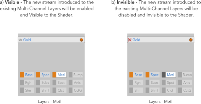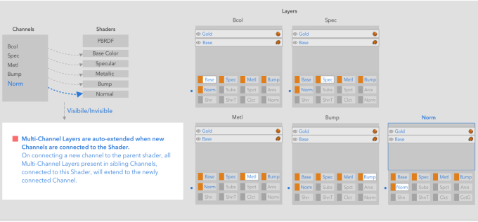 新しいチャネルをダウンストリームシェーダーに接続すると、レイヤー内の既存のマテリアルが認識され、新しいストリーム(接続されたチャネル)に自動拡張されます。 Multi-Channel Properties。新しいストリームはVisibleまたはInvisibleダイアログで選択したオプションによって異なります。