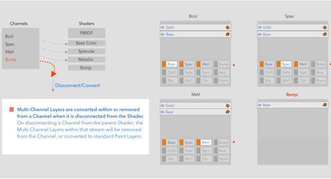 新しいチャンネルがシェーダーに接続されると、マルチチャンネルレイヤーは自動的に拡張されます。