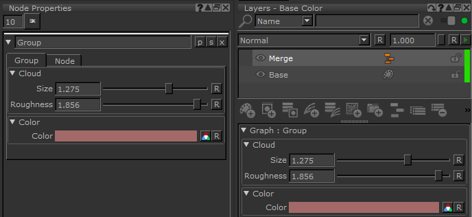 公開されたプロパティは、グループのノードプロパティパレットと、レイヤーパレットの関連するグラフレイヤーに表示されます。たとえば、CloudとColorノードを含むノードグラフ内のマージされたグループがあるとします。