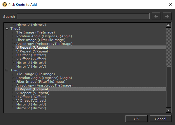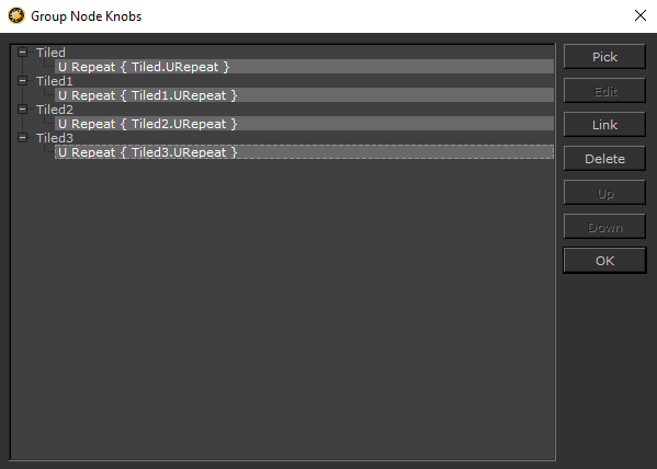 グループノードと同様に、グループノードの一種であるマテリアルノードにノブ(コントロール)を追加できます。 Group Node Knobsダイアログ。最初に、マテリアルノードに含まれるノードのプロパティを公開し、それらをリンクして、マテリアルノードのプロパティを変更するためのコントロールを作成する必要があります。