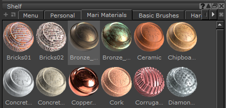 の中にShelfパレット、 Mari Materialsタブまたはマテリアルを含むカスタムタブで、マテリアルをノードグラフにドラッグします。