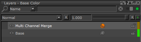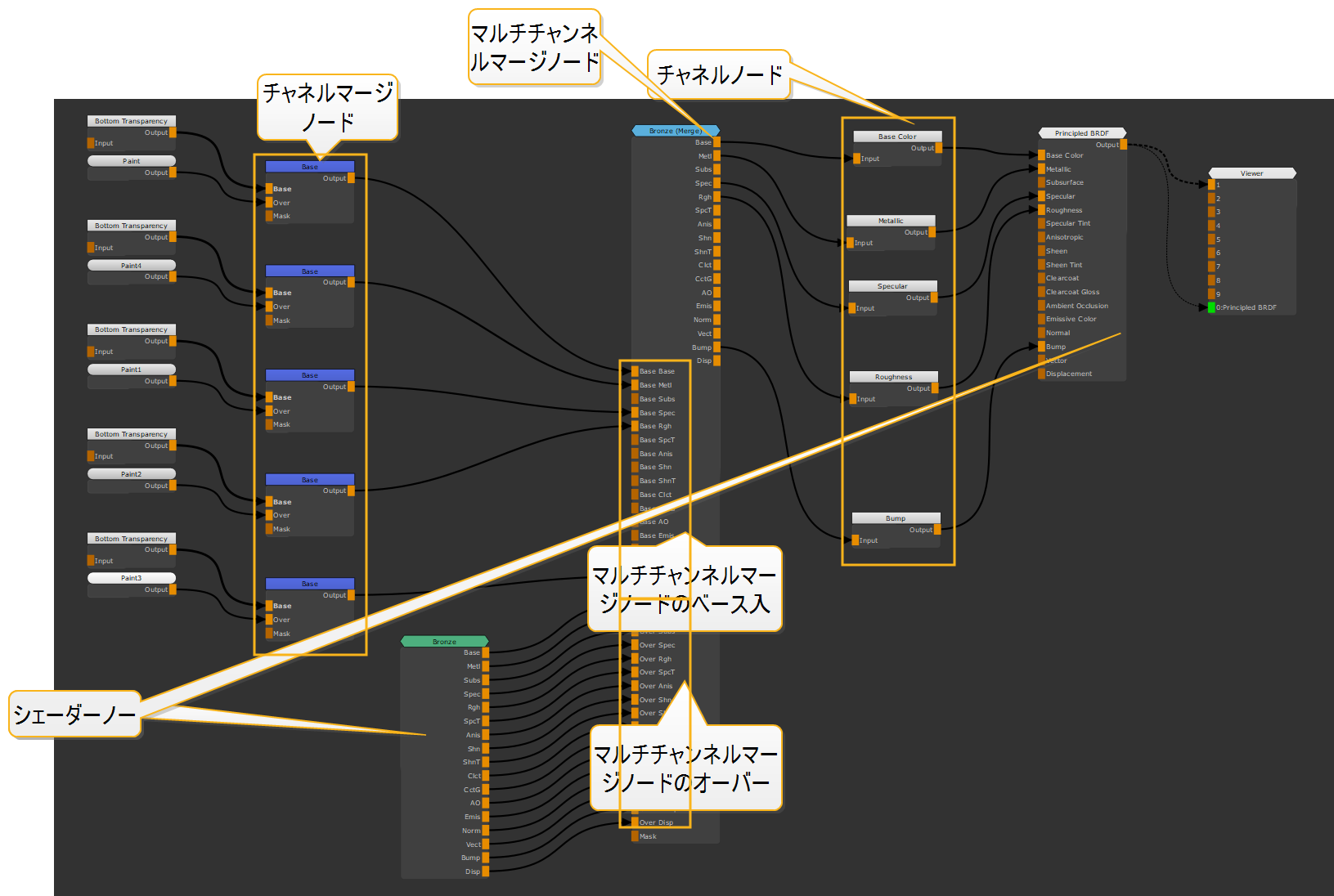 • Multi Channel Mergeノードの出力を必要なChannelノードの入力に接続します。例:Multi Channel Mergeノードを接続するBaseへの出力Base Colorチャネルノード。