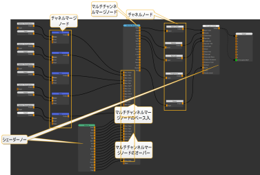 これにより、Materialノードの出力がMulti Channel Mergeノードの出力に自動的にバッチ接続されます。 Over入力。