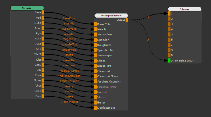 •マテリアルのストリーム/マテリアル出力に一致するシェーダーの適切な入力にチャネルが作成および接続されています。見るプリセットから複数のチャンネルを作成する自動作成およびチャネルの接続用。