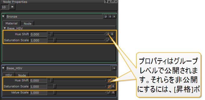 公開されたプロパティは、マテリアルノードレベルの1つのノブ(コントロール)の下でリンクされます。 Node Propertiesパレット。