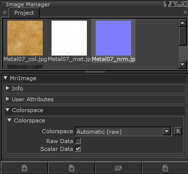| 6. | の中にImage Managerパレット、テクスチャファイルにタグを付けるScalar Dataこの例では、カラーテクスチャを除きます。 Metal07_col.jpg。 見るカラーデータとスカラーデータスカラーデータの詳細については、 |