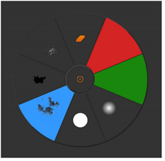 Mariには、構成可能な画面上の「パイ」コントロールメニューが含まれており、これを使用して、一般的なブラシのヒントや色の設定を選択できます。最大7つのブラシチップまたは色を「パイ」コントロールに追加できます。また、 PaintそしてPaint Buffer Eraserツール。パイ選択を使用するには: