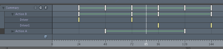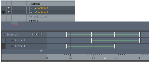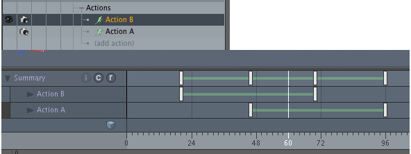 上の画像ではAction Bフレーム24と72の間で再生され、 Action Aフレーム73と95の間で再生され、 Action Bフレーム96と144の間で再び再生されます。