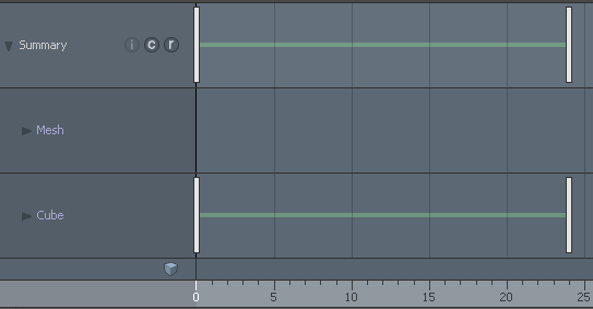 タイムラインが更新され、アニメーション全体とキューブアニメーションの概要が表示されます。 0から始まり、24秒で終わります。
