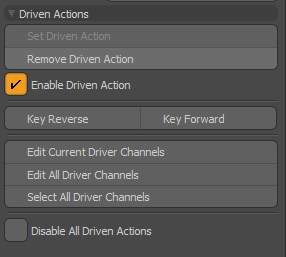 • Set Driven Action -現在のアクション([アクション]ポップアップで選択)をドリブンアクションとして設定し、初期の空のドライバーチャネルを追加します。このドライバーチャネルにキーが設定されるまで、目に見える変化はありません。
