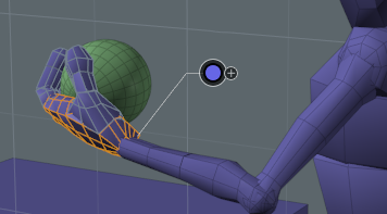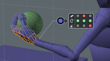 モードボタンをクリックするポップアップを開きます代替モードを指定します。以外のモードを選択した場合None、 Modo 3Dビューポートで暗黙の選択を伴う追加項目を示します各アイテムの中心位置にある小さな色付きのドット。階層接続は、アイテム間に描かれた点線として表示されます。図では、 Branch Relatedモードが選択されているため、明示的に選択された1本の指のジョイントは、他のすべての指も暗黙的に選択します。各ドットの色は、キーフレームのステータスを表します(一般的なコントロールと同じ):緑はアニメーション、赤はキーフレームの位置、青は混合状態、オレンジは非アニメーション要素用です。