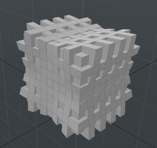 テクスチャフォールオフは、プリセットブラウザを使用して追加できます。以下の手順は、フォールオフを使用して、ディンプルテクスチャをポリゴンベベルツールに適用する方法を示しています。 メッシュ操作リスト。これにより、メッシュの表面全体でベベルされたポリゴンがインデントされます。この手順では、メッシュがすでに存在していることを前提としています。この場合は、下の図に示すように、各軸を横切る9つのセグメントを持つプロシージャキューブを使用します。