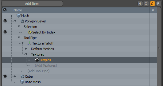 | 4. | これで、ベベルツールにテクスチャを適用する準備ができました。の中にメッシュ操作リスト、展開しますTool PipeのためにPolygon Bevelそしてクリック(Add Tool Pipe)。 |