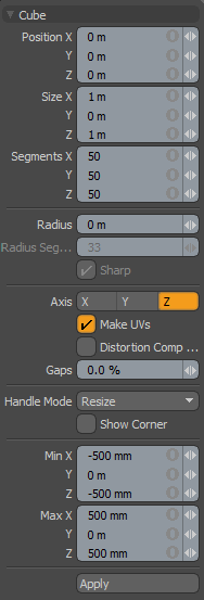 | 2. | キューブのプロパティを次のように設定して、 Apply。 |