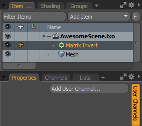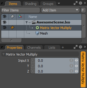 このチャネルは、3Dアイテムのマトリックスチャネルまたは他のチャネルモディファイヤ出力からの複数の入力リンクを受け入れます。Modoこのチャネルをリンクしたときに使用した順序で行列を乗算します。 |