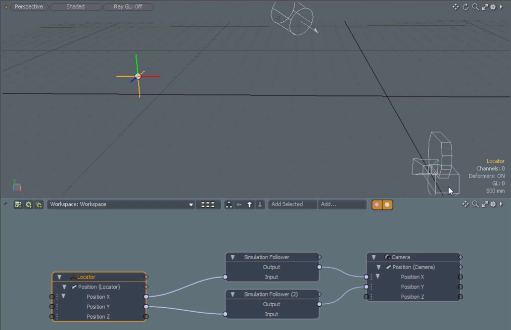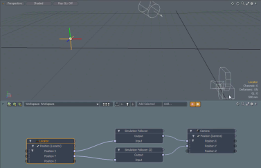 クリックPlay Animationシーン内のロケータを移動して、シミュレーションの動作を確認します。カメラは、少し遅れてロケーター項目に従います。あなたは変更することによってその遅延を制御することができますRateシミュレーションフォロアの値Propertiesパネル。レートが低いほど、カメラの動きの計算に使用されるフレームが少なくなります。
